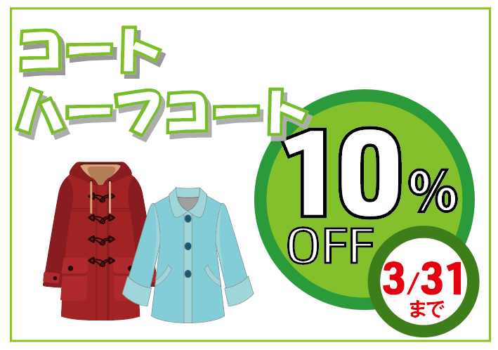 【恒例のコート・ハーフコート10%OFF】 期間:3/31まで 10%OFF 冬の期間がんばってくれましたコートに お疲れ様のメンテナンスは如何でしょうか。 ご来店をお待ちしております。(*^_^*)(_ _)